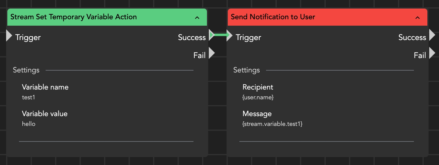 This wildcard is replaced with the value of a previously set, temporary variable. These temporary variables must be set within the stream and are only available while the stream is running.