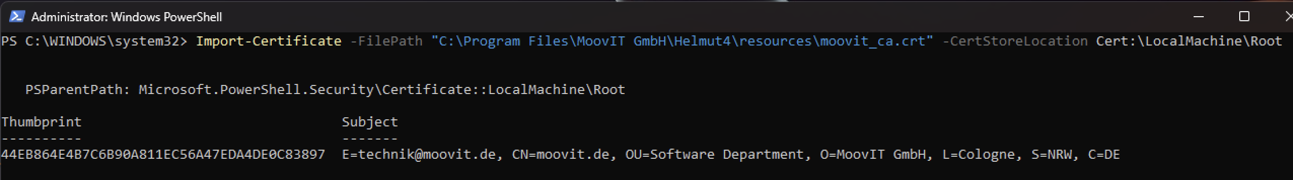 Import-Certificate -FilePath "C:\Program Files\MoovIT GmbH\Helmut4\resources\moovit_ca.crt" -CertStoreLocation Cert:\LocalMachine\Root