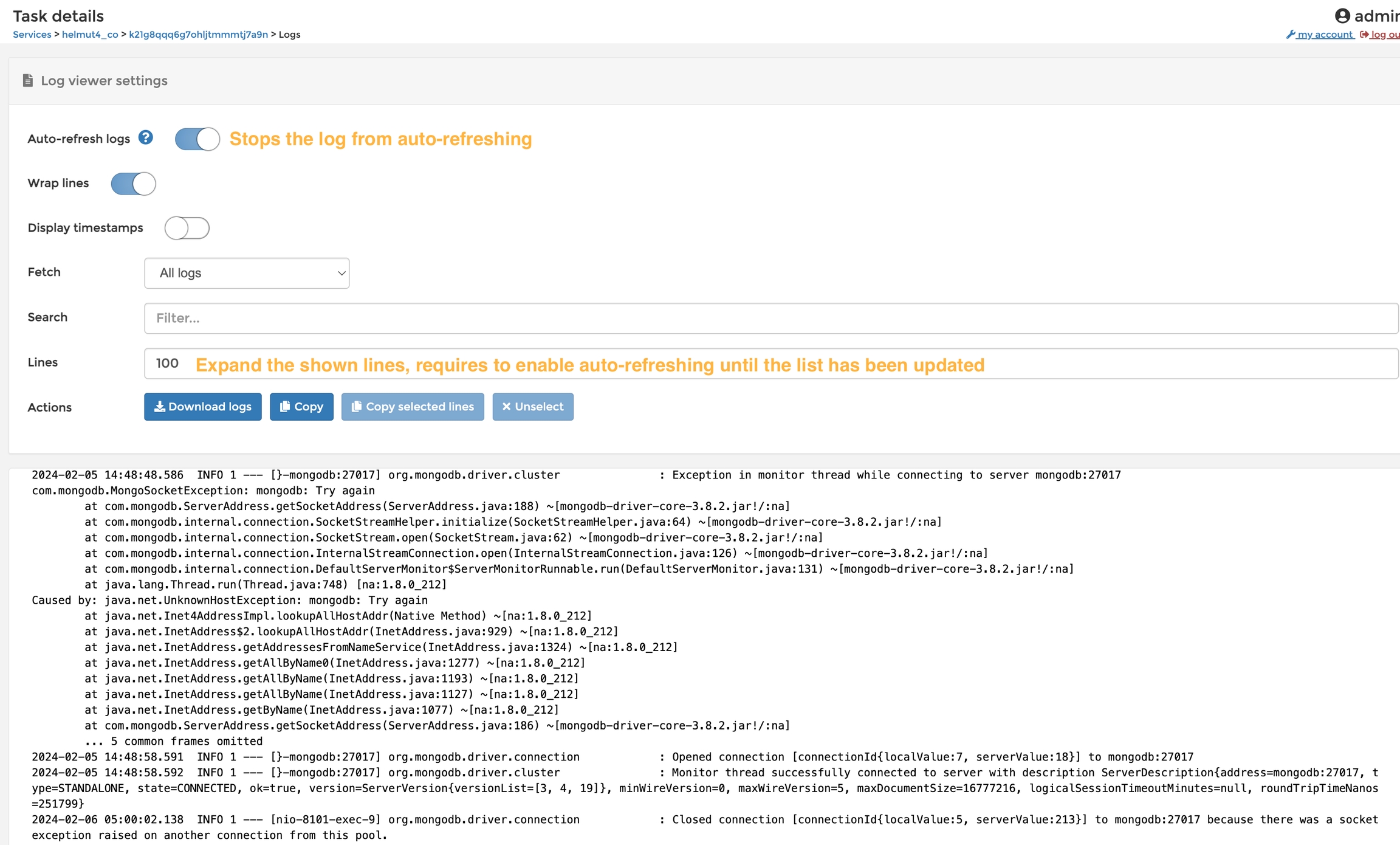This will open a new window displaying the container's log. If necessary, you can expand the displayed lines until you find the desired log entry. When searching for a specific entry, you need to disable the auto-refresh toggle, as the log tends to jump to its end while searching.