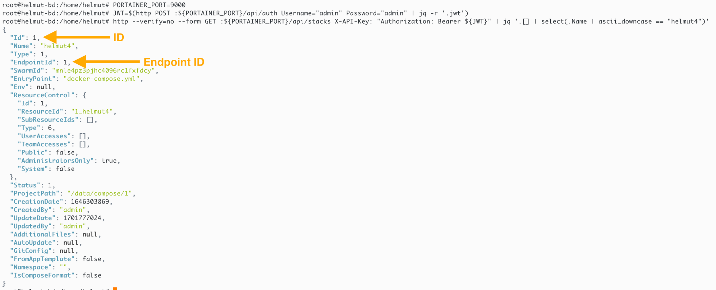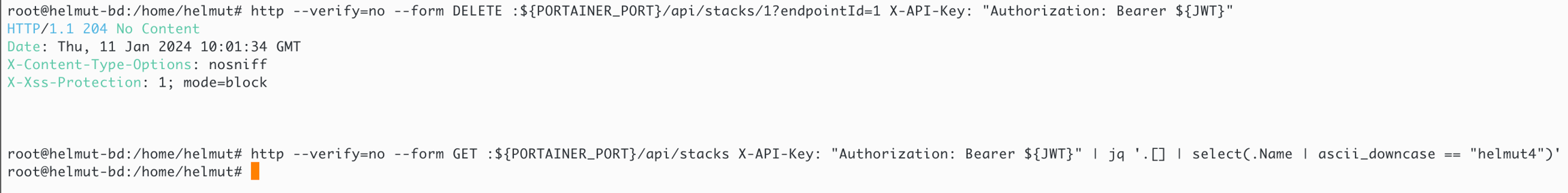 To delete the dedicated 'helmut4' stack, you need the ID & EndpointID. Please replace those in the given command below to match your environment.