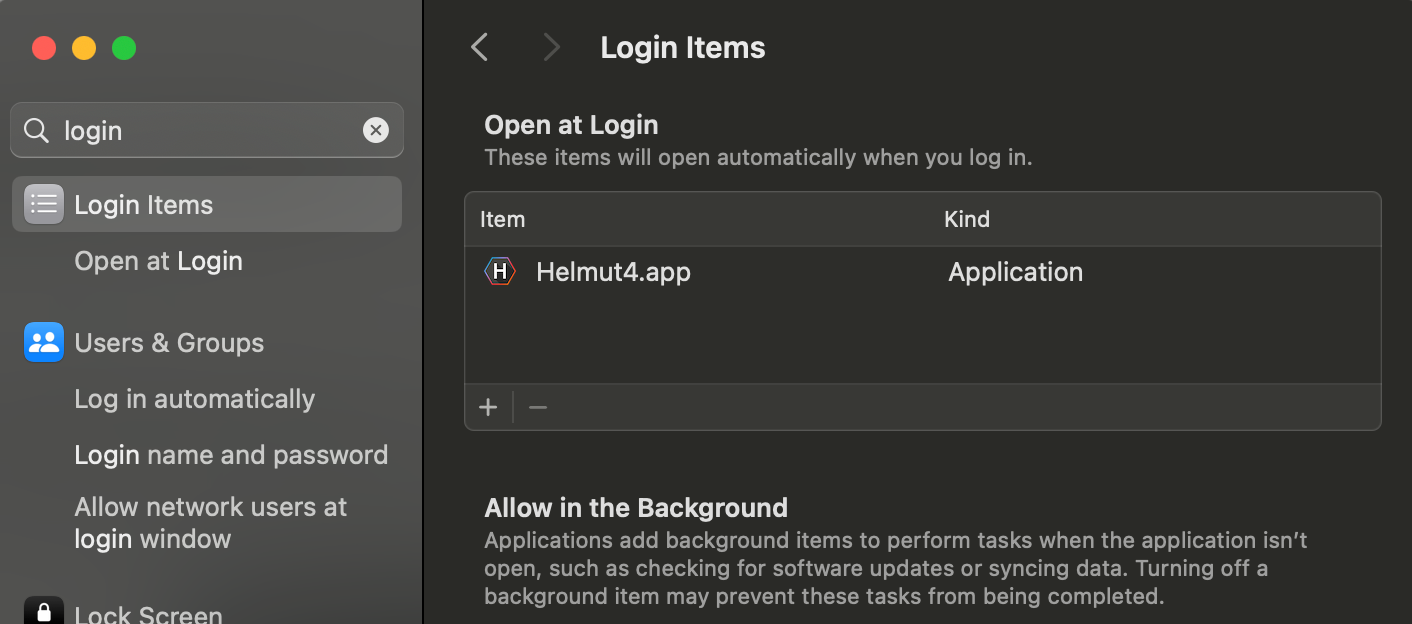 To set up the Helmut4 application as a login-item, check out Apple's support article.