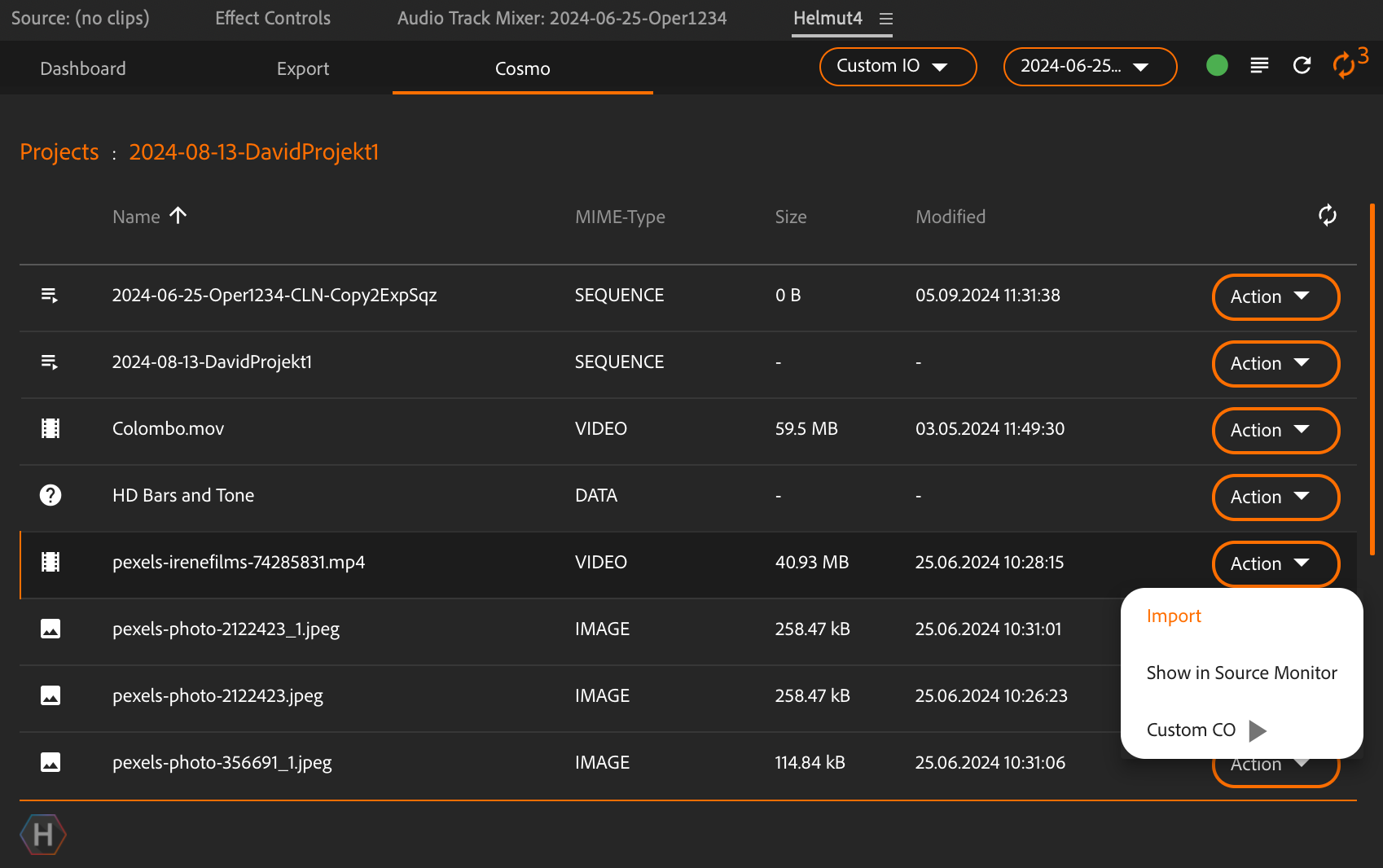 The Cosmo panel offers some very useful functionality. It is possible to browse and look into other projects (depending on your group permissions). This can facilitate collaboration, as one can preview an asset in the Adobe Source Monitor.