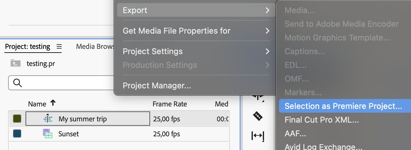 <figure><img src="https://content.gitbook.com/content/ttnkf7qEIoqtmdv6485i/blobs/2VYa9BpdfOx4nXGAnW53/image.png" alt=""><figcaption><p>Create new Premiere Pro project from sequence</p></figcaption></figure>