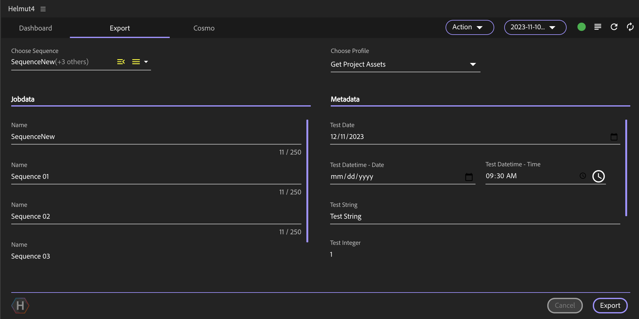 Utilizing the export panel requires the presence of at least one [Export](https://docs.helmut.de/helmut4-releases/v4.10.1/helmut4-components/helmutio/streams/io-event-triggers/export) profile for the project group.