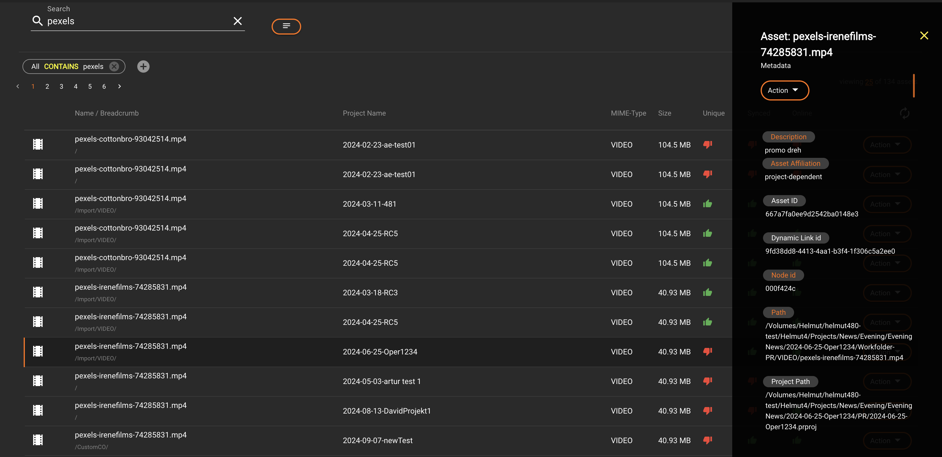 * A red thumbs-down indicates that the asset is not unique and is used in at least two projects. To find all referenced projects, click the asset to open the side panel. Clicking the "Path" metadata icon will apply a file path filter, displaying all associated projects.
