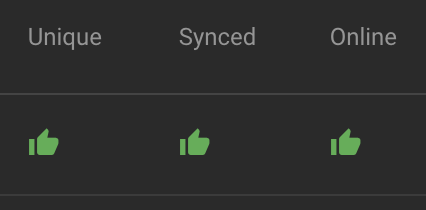 <figure><img src="https://content.gitbook.com/content/ttnkf7qEIoqtmdv6485i/blobs/nfzz92t7neTcOazP60ZJ/image.png" alt="" width="327"><figcaption><p>Unique / synced / Online Status of an asset (thumbs down)</p></figcaption></figure>