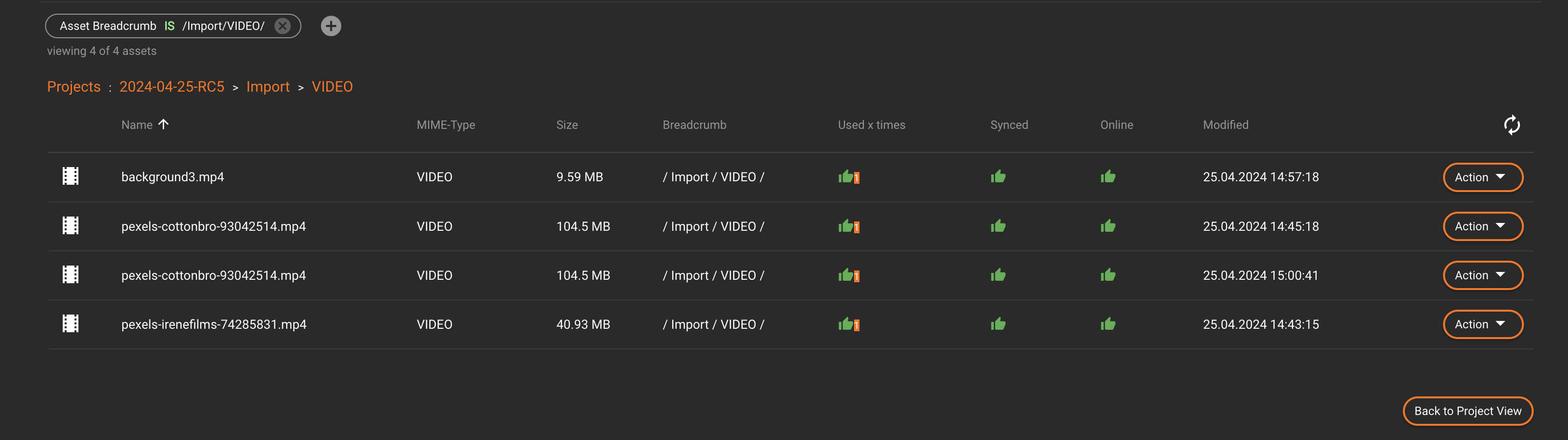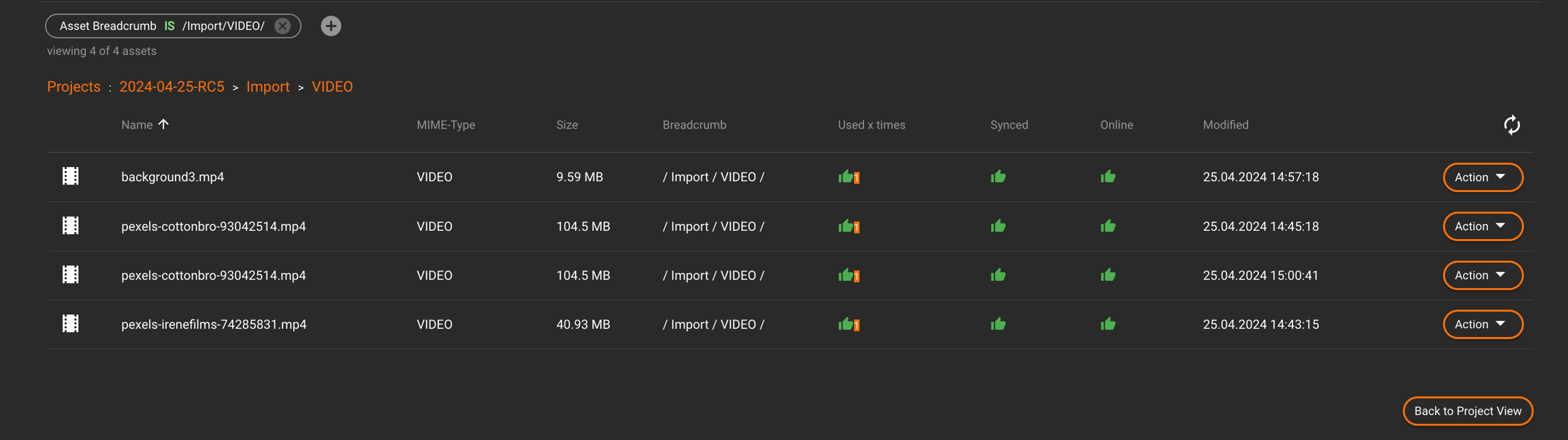 This action will display all projects that reference this asset (where the status is unique = false). This view provides an overview of how many projects are associated with the asset.