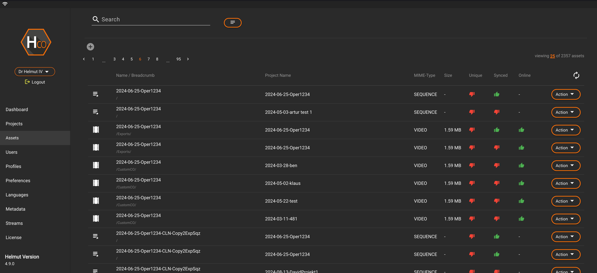 A red thumbs-down indicates that the asset is pending and waiting to be synced into the dedicated project via the Helmut4 Panel.