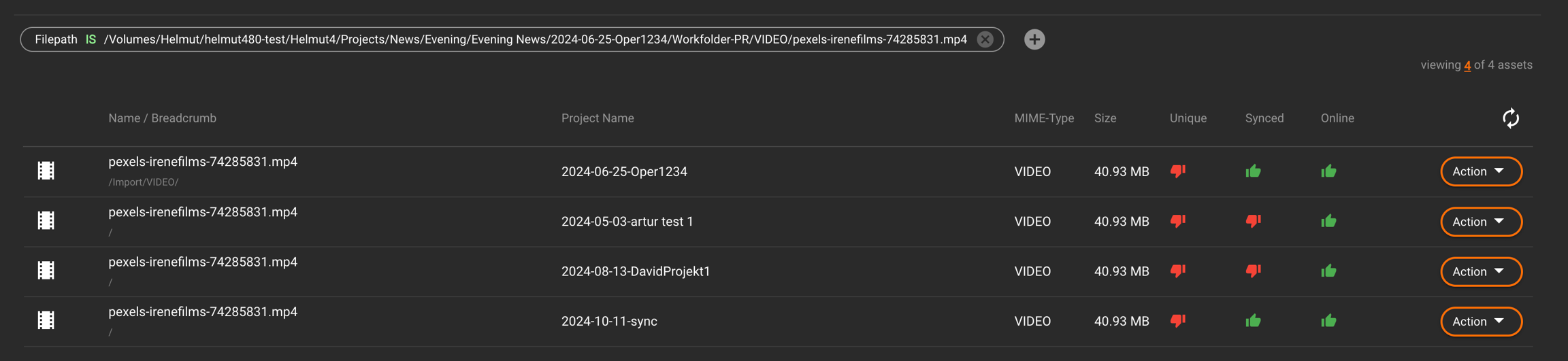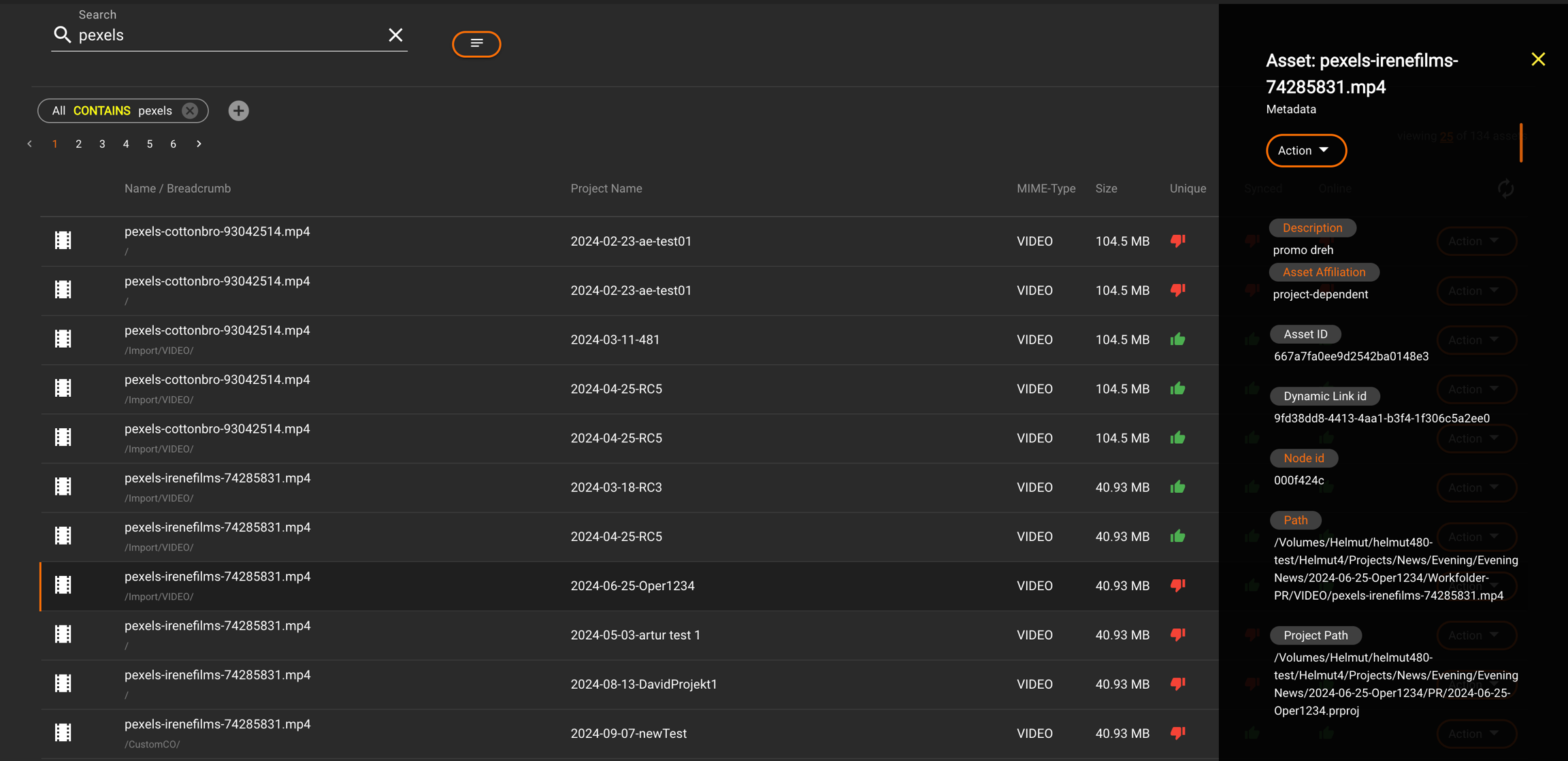 A red thumbs-down indicates that the asset is not unique and is used in at least two projects. To find all referenced projects, click the asset to open the side panel. Clicking the "Path" metadata icon will apply a file path filter, displaying all associated projects.
