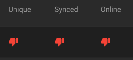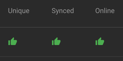 The "Synced" column shows either a green thumbs-up or a red thumbs-down icon.