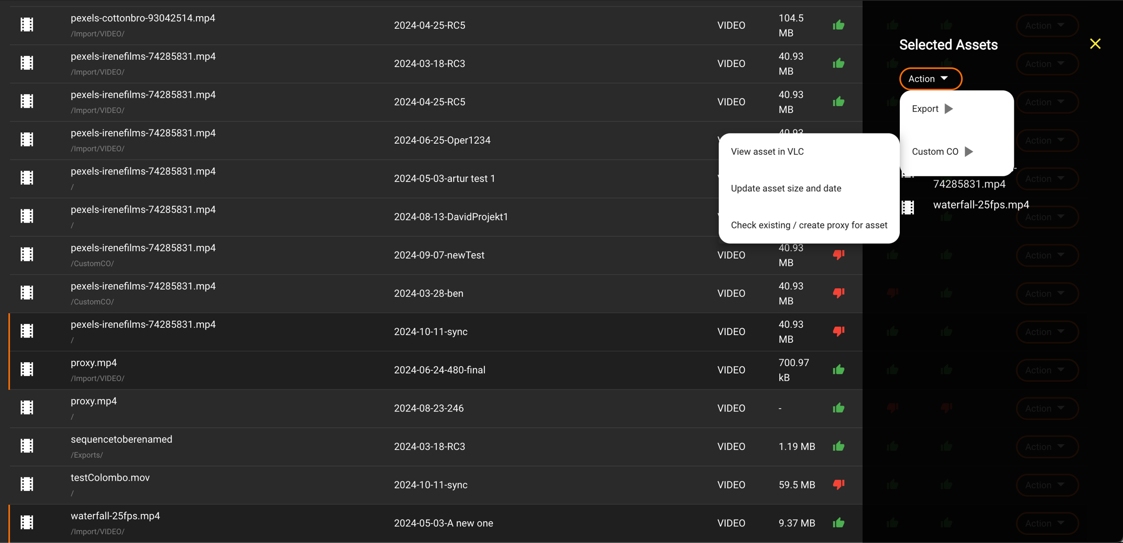 For example, if both a bin and a video asset are selected, the Custom CO or Web Export actions cannot be executed, as one of the items does not meet the necessary requirements.