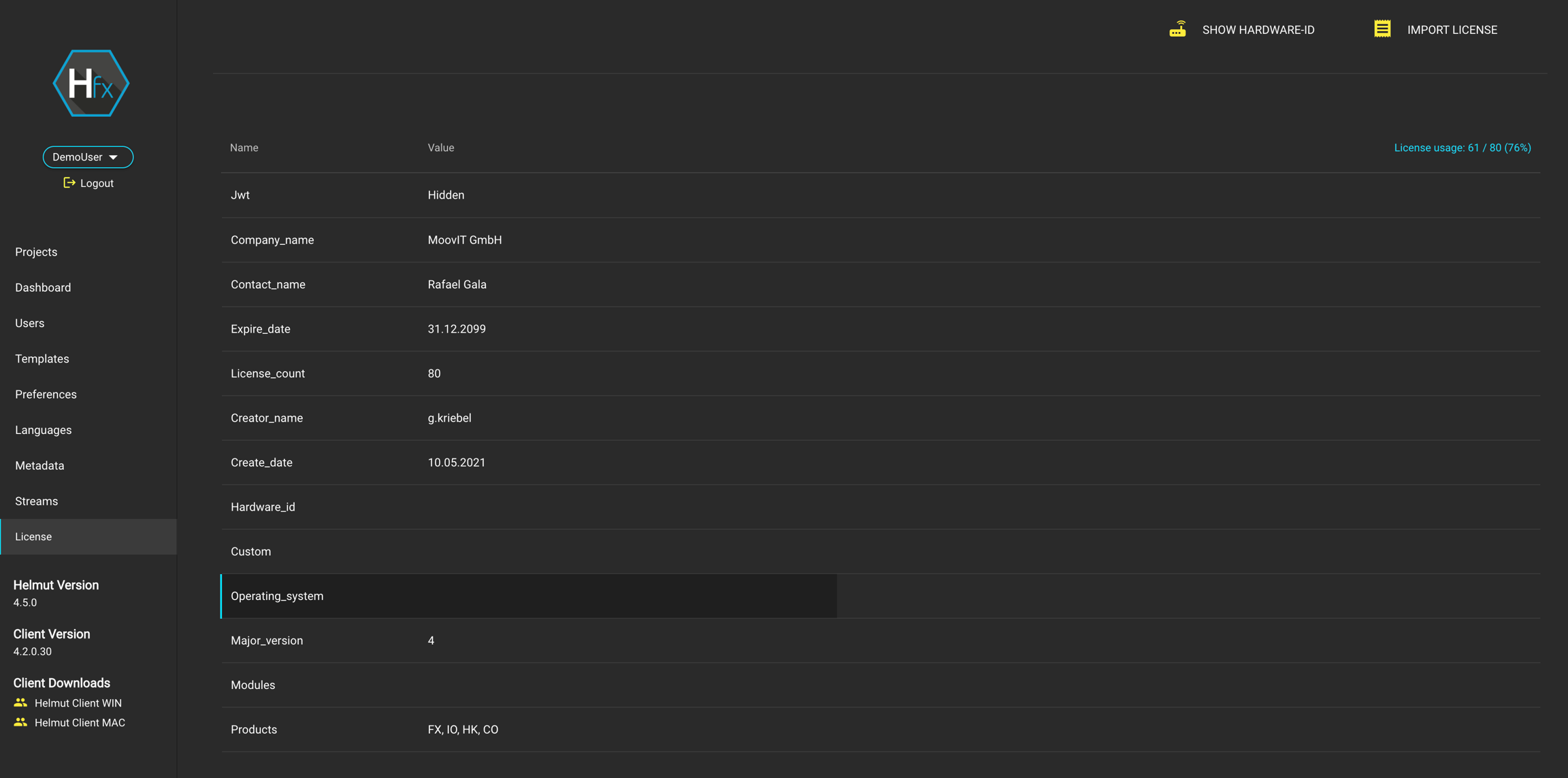 This button will display the Hardware ID of the Helmut4 host, which is necessary for creating the license. This is particularly important for any staging, POC, and demo environments.