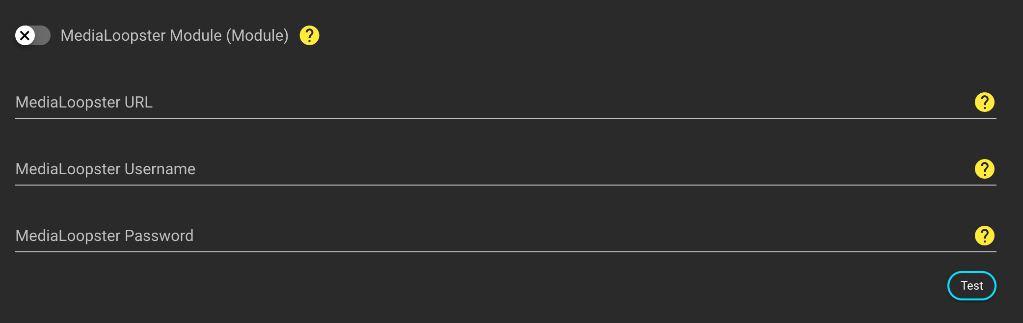 Use the "Test" button to check the input's correctness by connecting to Medialoopster