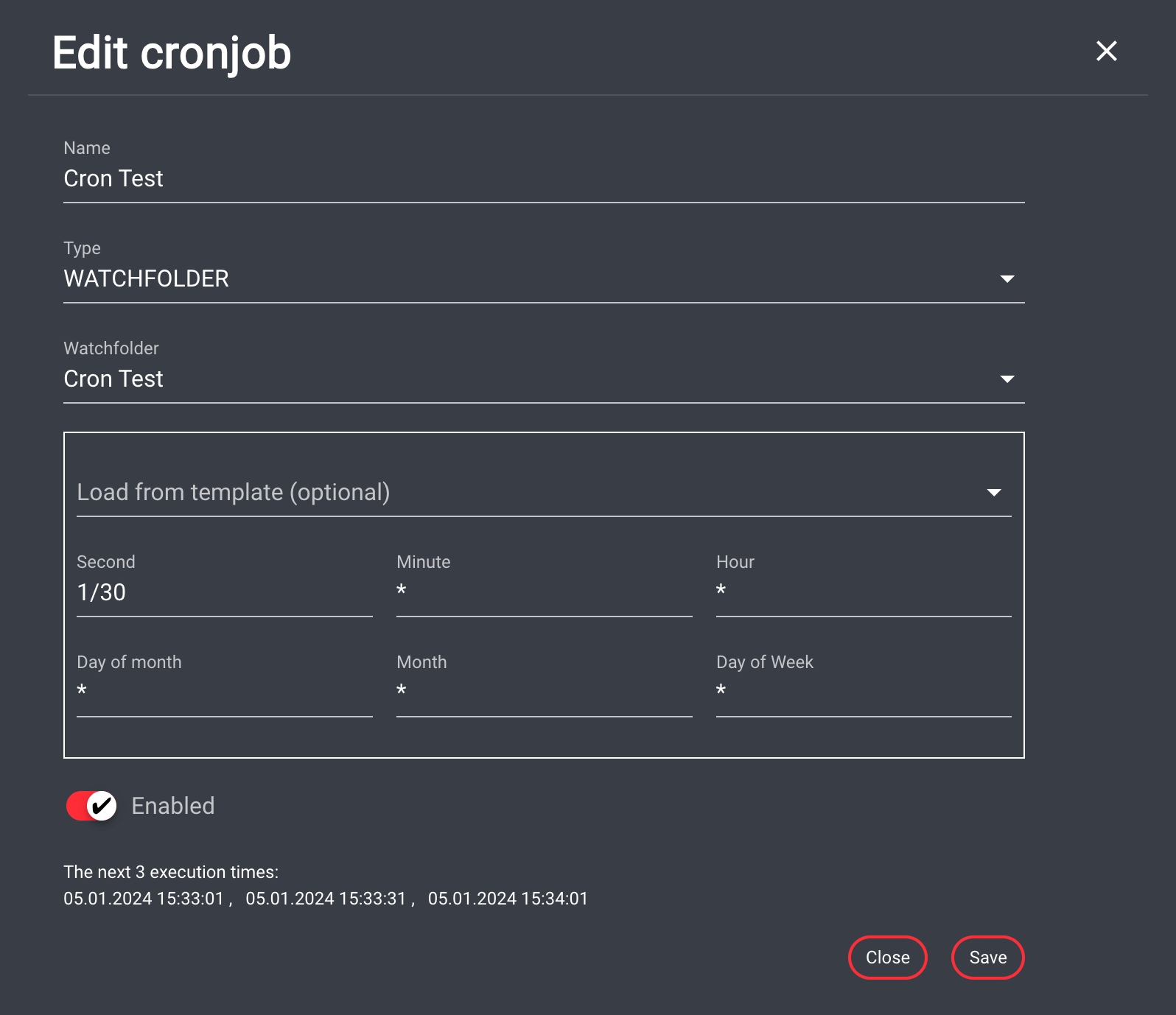 Clicking "Save" closes the dialog and saves the watchfolder.