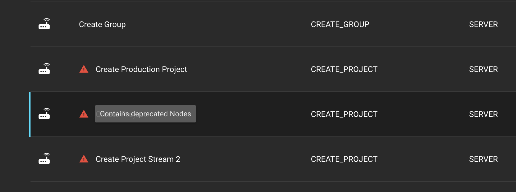 The first indicator can be observed within the [Streams](https://docs.helmut.de/helmut4-releases/v4.10.1/helmut4-components/helmutfx/streams) tab. Any stream containing deprecated node(s) will display a red triangle with an exclamation mark, accompanied by the hover information 'Contains deprecated nodes'.