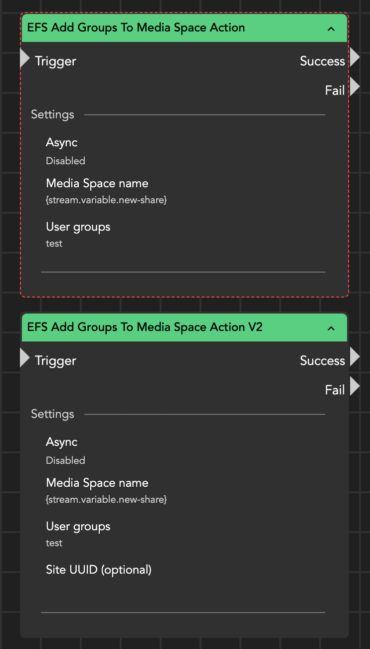 The functionality has been expanded, as illustrated in the screenshot below for the EFS Add Groups to Media Space action, which now includes a Site UUID field.