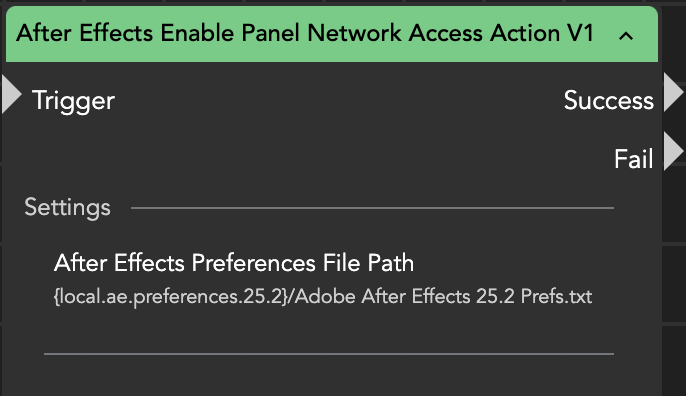 The After Effects Enable Panel Network Access Action node configures the After Effects preferences to allow scripts to write files and access the network. This setting is essential for the Helmut4 panel to run and process assets, such as when using Autoimport