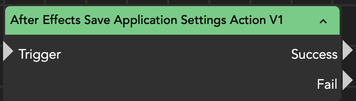 The After Effects Save Application Settings Action node saves the current After Effects parameters to the local configuration file.