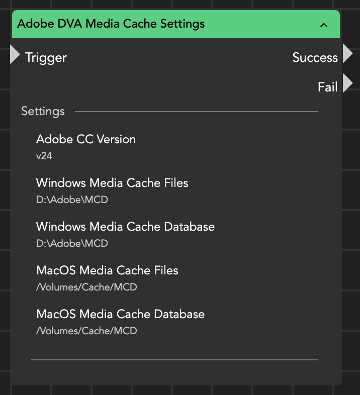 The DVA (Digital Video Application) Media Cache node allows you to configure cache folders for both the Media Cache and Media Cache Database. This setting applies to Premiere Pro, After Effects, Audition, and Media Composer.