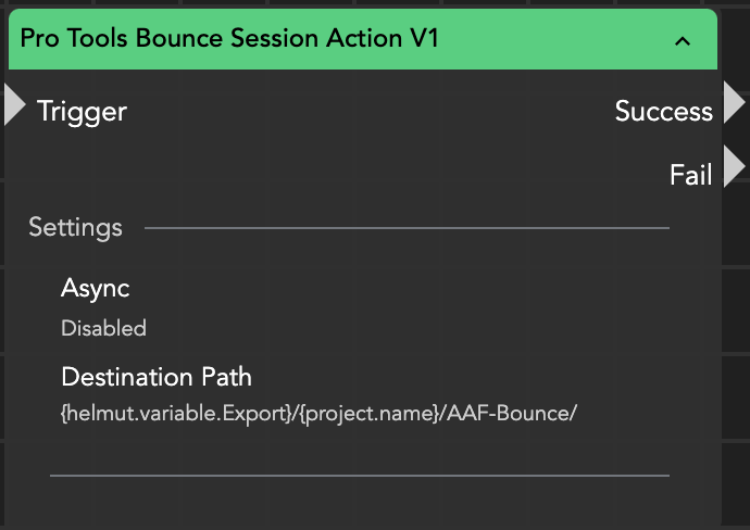 This node is specifically designed for use with Avid Pro Tools. When triggered, it initiates the Bounce Mix command on the currently opened session. The node takes parameters from the cosmo webexport dialog to customize the session bounce process. It automates the bounce operation by directing the output to a specified destination folder.
