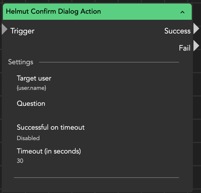 The Helmut Confirm Dialog Action allows you to create a confirm dialog in Helmut where users can approve or deny a specified question. This action takes the question as an input parameter. Additionally, you can set a timeout, and if the timeout is reached before a response is received, the node will fail.
