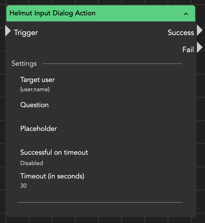 Based on the user's interaction (either providing an answer or denying the input), the node will generate a response accessible via the wildcard {stream.last_result} or {node.result.?}. This response captures the user's input or the outcome of the action, facilitating further processing within the Helmut environment.