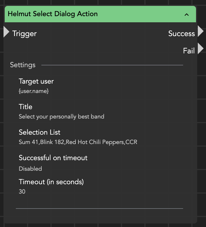 The Helmut Select Dialog Action enables you to create a list dialog in Helmut where users can either select an option or decline the selection. This action requires a title as an input parameter. Additionally, you can configure a timeout, and if the timeout expires before a response is received, the node will fail.