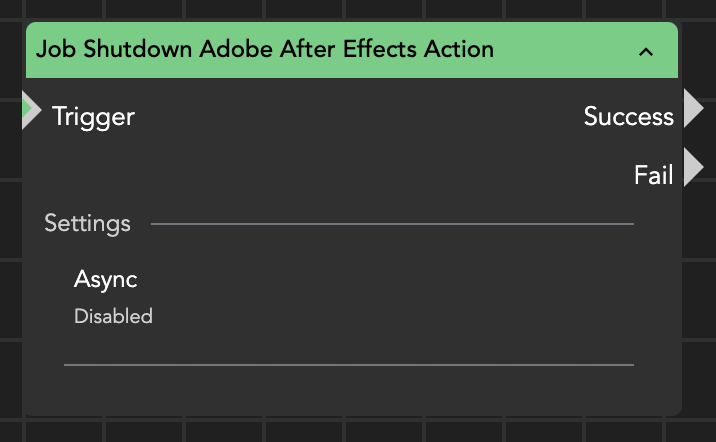 <figure><img src="https://content.gitbook.com/content/ttnkf7qEIoqtmdv6485i/blobs/HqoxfuFyPqxxau74aUmA/image.png" alt="" width="358"><figcaption><p>Job Shutdown Adobe After Effects Action</p></figcaption></figure>