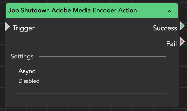 The Job Shutdown Adobe Media Encoder Action node can be used to close a running instance of Adobe's Media Encoder on a Windows or macOS client.