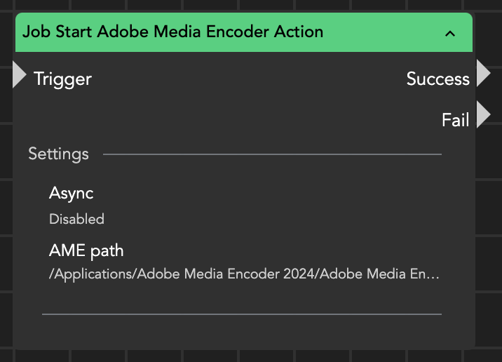 The Job Start Adobe Media Encoder Action allows you to initiate a specific version of Media Encoder by specifying the path to the .exe file (Windows) or .app file (macOS).