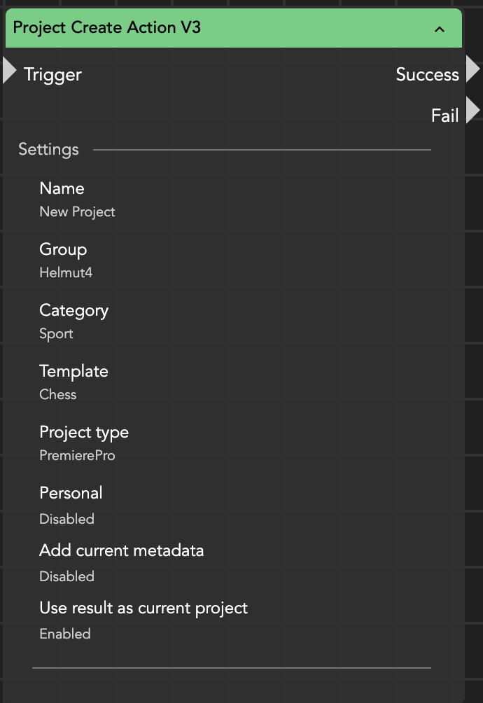 When executed, this node fires the [Create\_Project](https://docs.helmut.de/helmut4-releases/v4.10.1/helmut4-components/helmutfx/streams/fx-event-triggers/create_project) trigger (ensure your host client/server has permission to run it), and the associated streams will use the parameters you supply to instantiate the project.