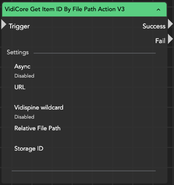 With the use of the VidiCore Get Item ID By File Path Action node it is possible to get the file's corresponding item ID by giving the relative file path including the extension of the file. When enabling the Vidispine wildcard switch it allows searching file names regardless of the file's location. Because of this, file paths starting with * can be used to search globally. On top of that the query parameter "wildcard=true" will be set in the background. By disabling the switch, the file path has to be inserted completely and no wildcard query parameter will be supported.