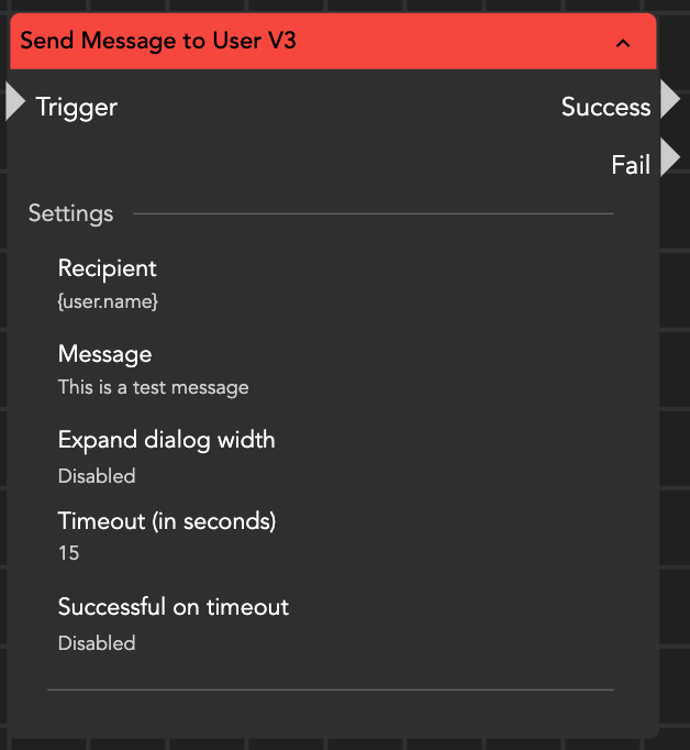 The "Send Message to User" Action node enables the sending of a message to a user.