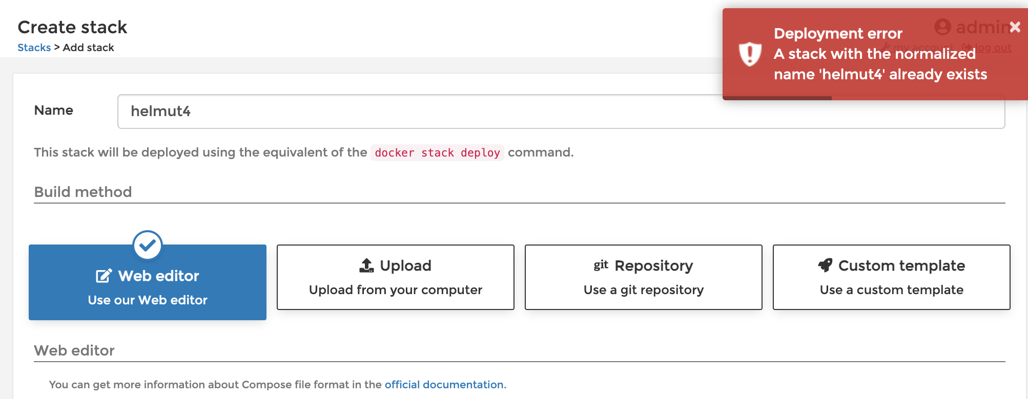 If you encounter an error message from Portainer stating that a stack with the specified or normalized name 'helmut4' already exists, you might need to address the issue on the server-side.