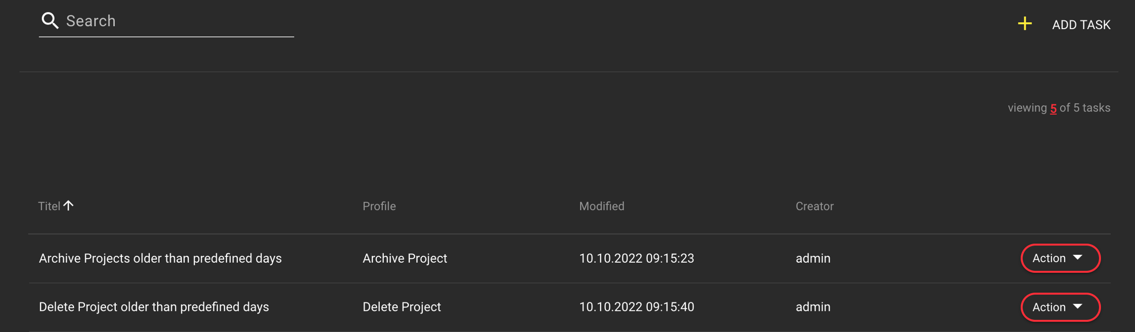 The Tasks menu enables the creation of a specific task for a dedicated HK profile, assignable to a dynamically changing list of projects. This list is automatically generated based on the defined parameters.