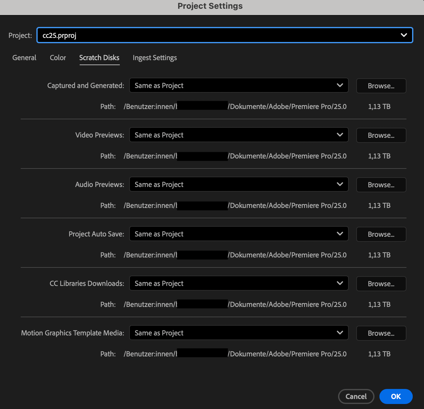 With the help of the Premiere Path Settings Action V2 (for versions until CC24) or V3 (starting with version CC25), all available paths that can be set in the project settings, can be pointed to a pre-defined location. This covers various paths for the scratch disk as well as the ingest settings tab in the project settings