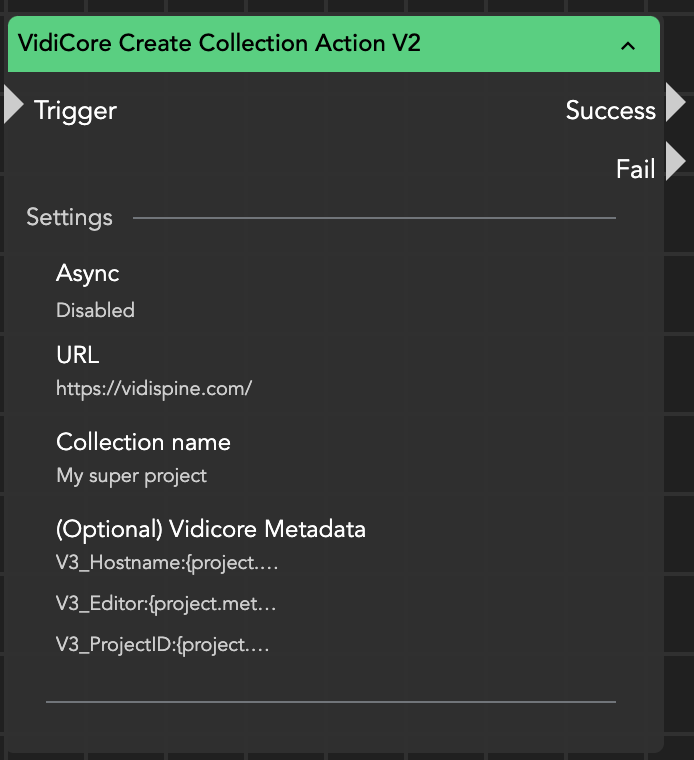 This node creates a new VidiCore project collection for a Premiere Pro project. The collection name and the URL of the VidiCore system can be defined in the node settings.