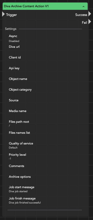 By using the Diva Archive Content Action node within a stream it is possible to trigger an archive object job in Diva. Standard input parameters are the URL with port, client ID (username…) and API key (… and password of the API user).
