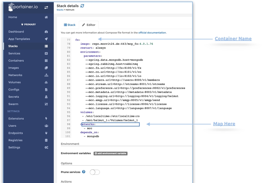 Navigate to the following services (fx, io, co, streams, users) and adjust the volumes entry