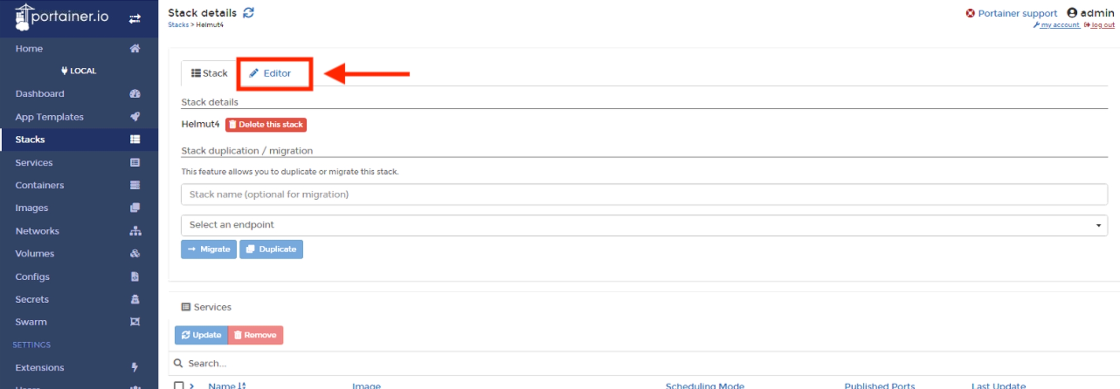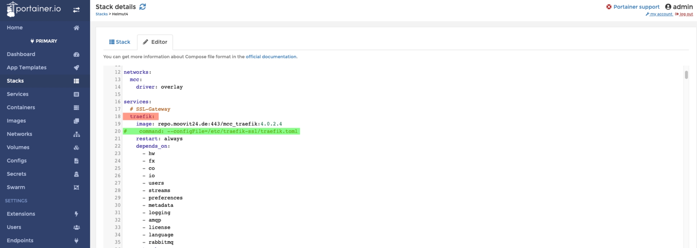 Traefik version 4.0.2.x: 1.) Copy the certificate (.crt) and the (.key) files from your computer to the Helmut server /root/certs folder. Make sure the files are named server.crt and server.key respectively 2.) Access Portainer by going to http://helmut_server_address:9000 3.) Go to Stacks