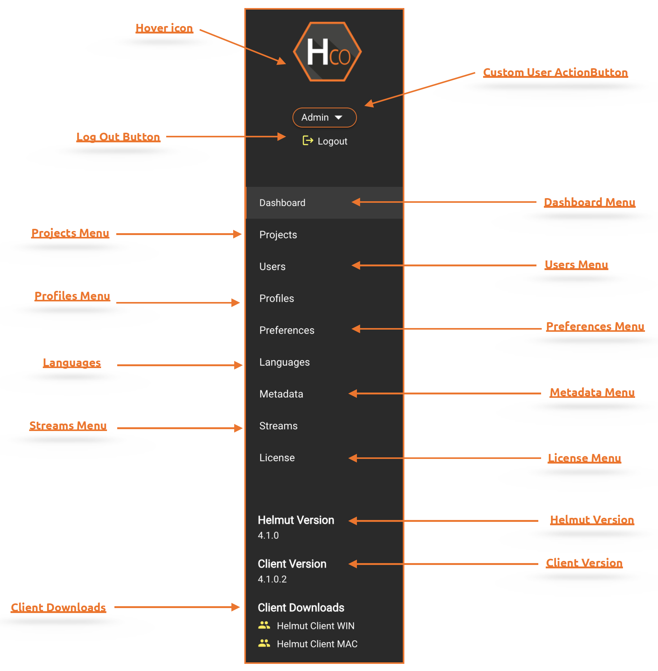 After a successful login as an administrator the complete side menu view will be loaded. This contains the following menu items: Some menu items correspond exactly to the menu items from HelmutFX.