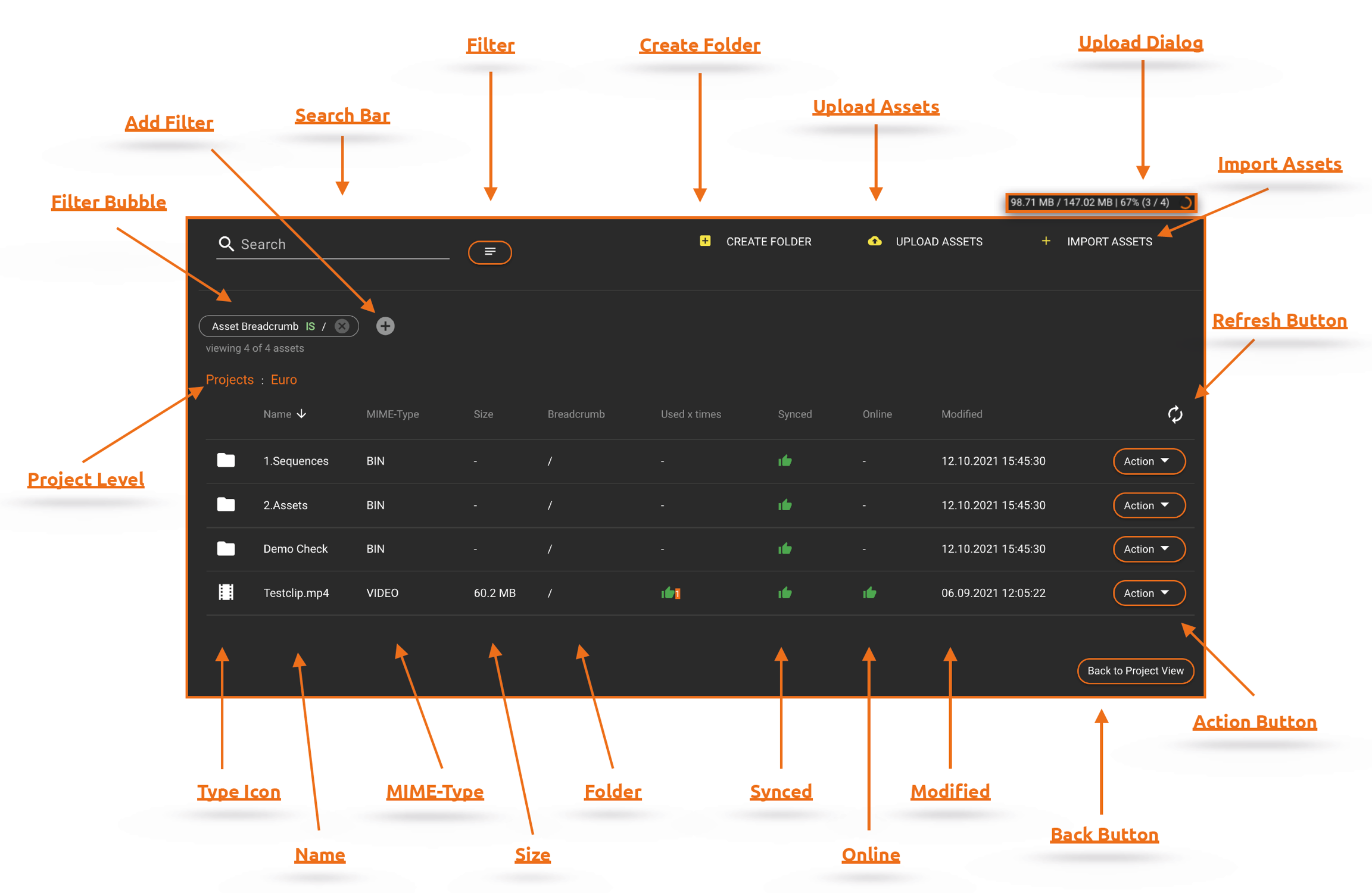 Folders, subfolders, assets (video / audio), as well as sequences and compositions are displayed.