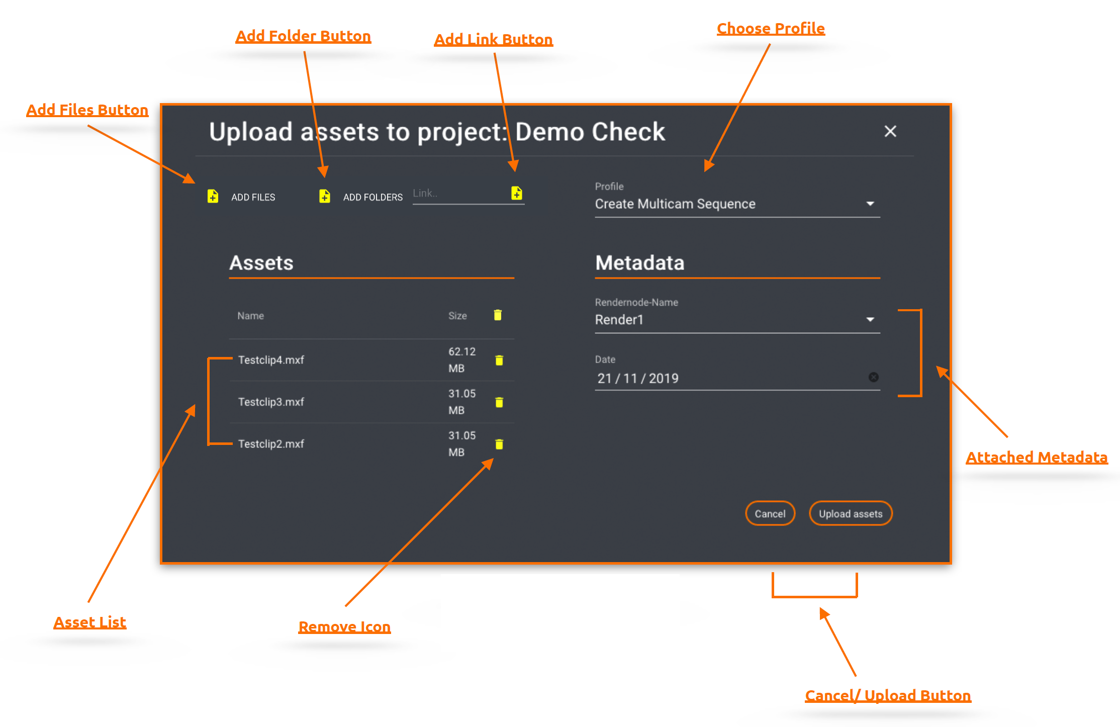 “Cancel” or “X” closes the dialog and “Upload Asset” starts the process.