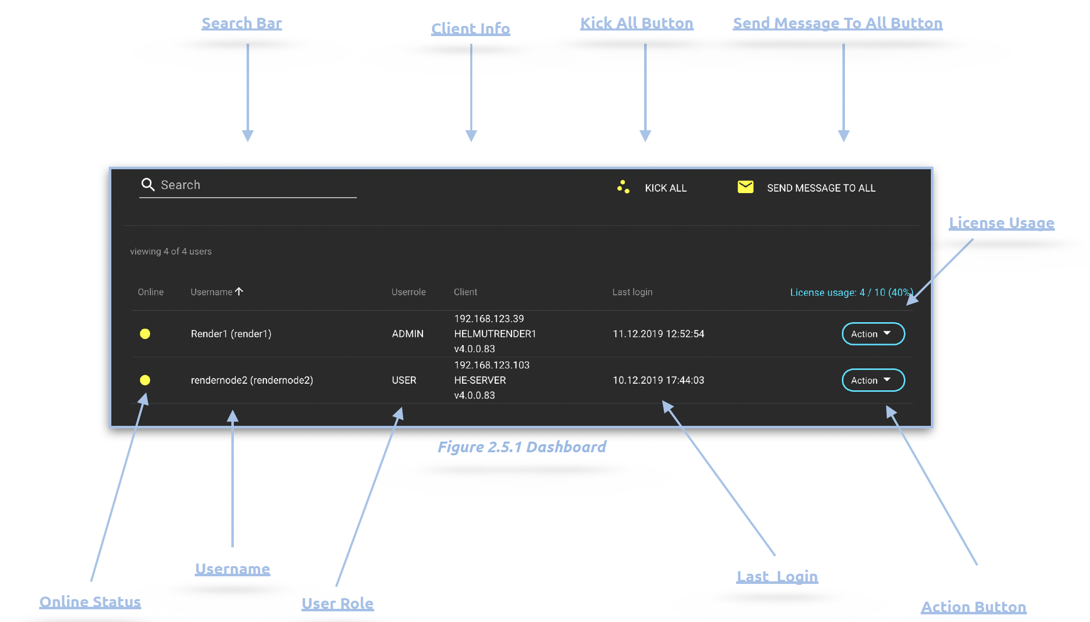 The Dashboard menu in HelmutFX displays all logged-in users, and provides access to various information including: