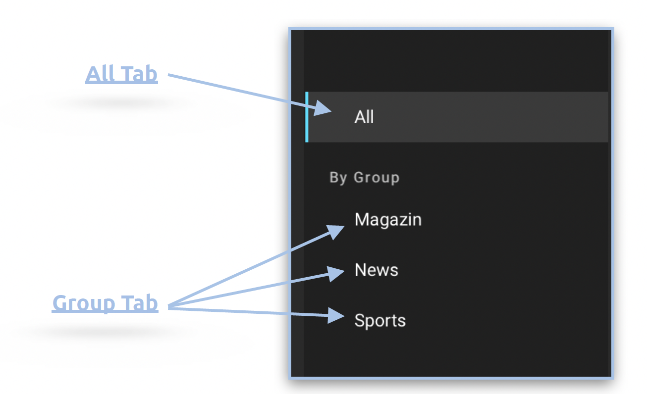 Displays all groups created in the system and filters the metadata entries displayed in the list view when selecting a group.