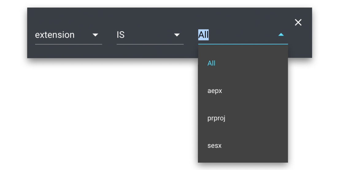 A filter bubble can be created by clicking on a metadata entry in the project overview or by clicking on a metadata entry in the hidden overlay. By clicking on the filter bubble itself, a dialog opens to edit it. See Figure 1.3.7. By default, the filters for group, category and template are active and set to ALL. If the group filter bubble is edited and a group is selected via the dialog that opens, only the categories belonging to the selected group can be selected via the category filter bubble. The same applies to the template filter bubble. It is possible to delete the group filter if a category has been chosen or the category filter if a template has been chosen. If a filter bubble has been edited, it is possible to reset the filter bubble to ALL using the displayed minus sign.