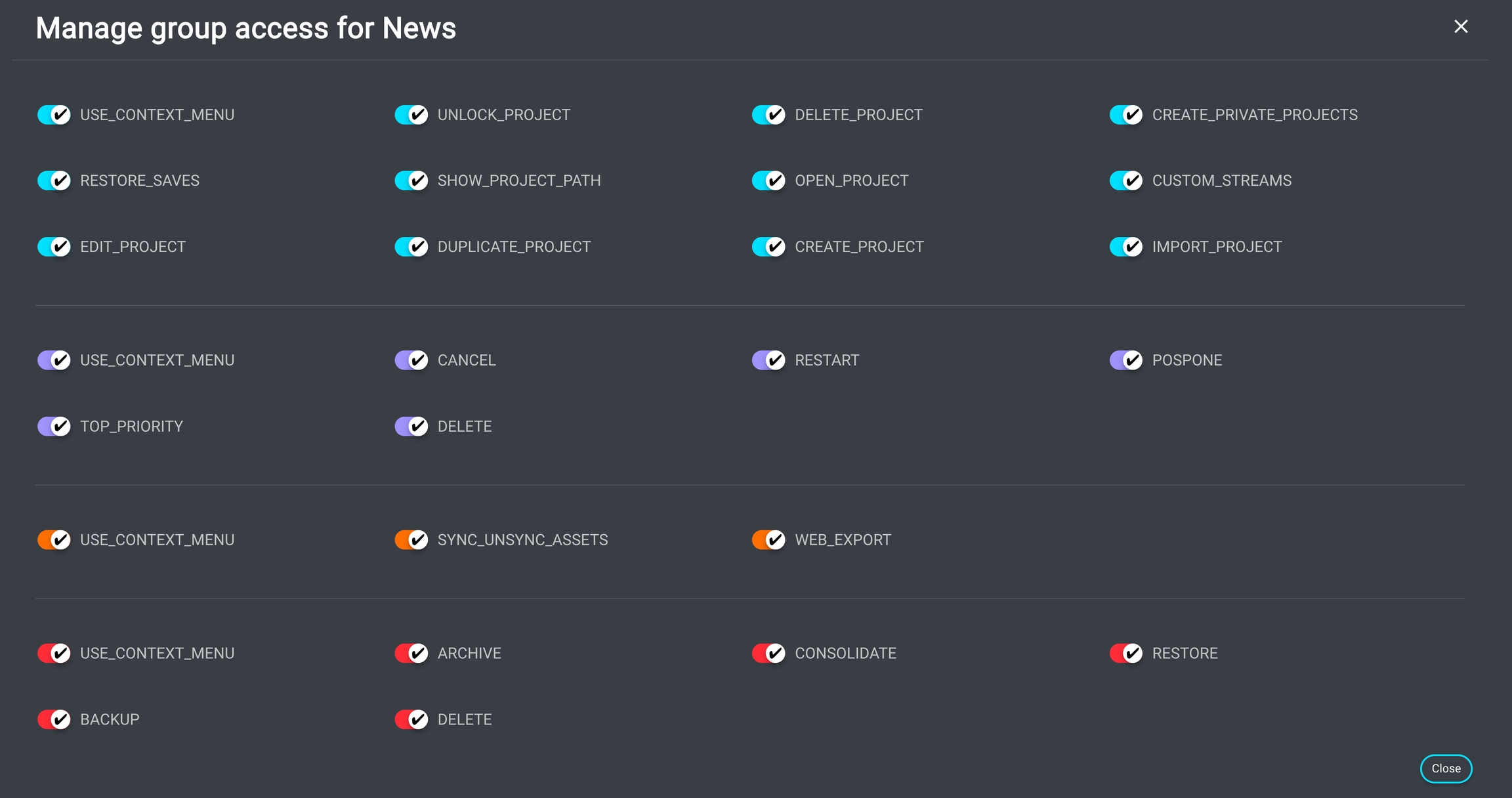 Opens the Manage Group Access dialog via which the access rights that apply to the group can be defined. The following Toggle Switches are available:
