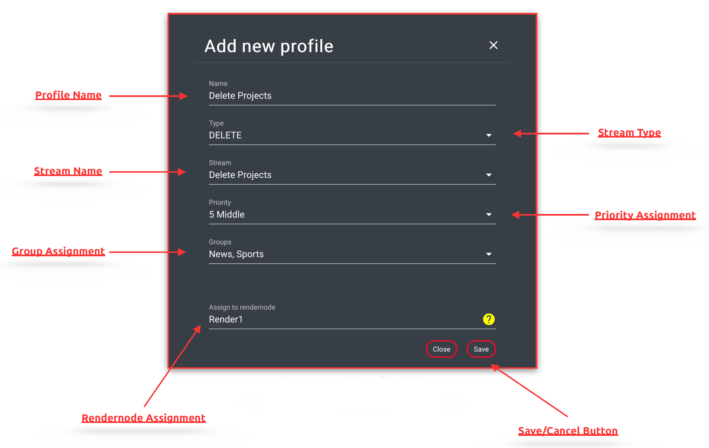“Save” closes the dialog and saves the profile. “Cancel" or “X” closes the dialog without saving.