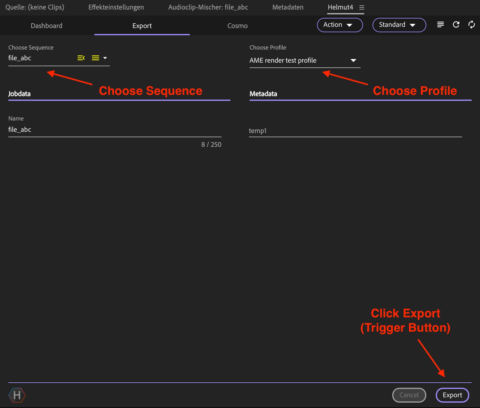 An Export stream will be executed as soon as a sequence export is executed via the Export tab of Helmut Panel. In order to operate an Export stream it is mandatory to create a profile beforehands and select one or multiple sequences to be exported. By conforming the "Export" button the profile will be triggered and the corresponding stream will be executed.