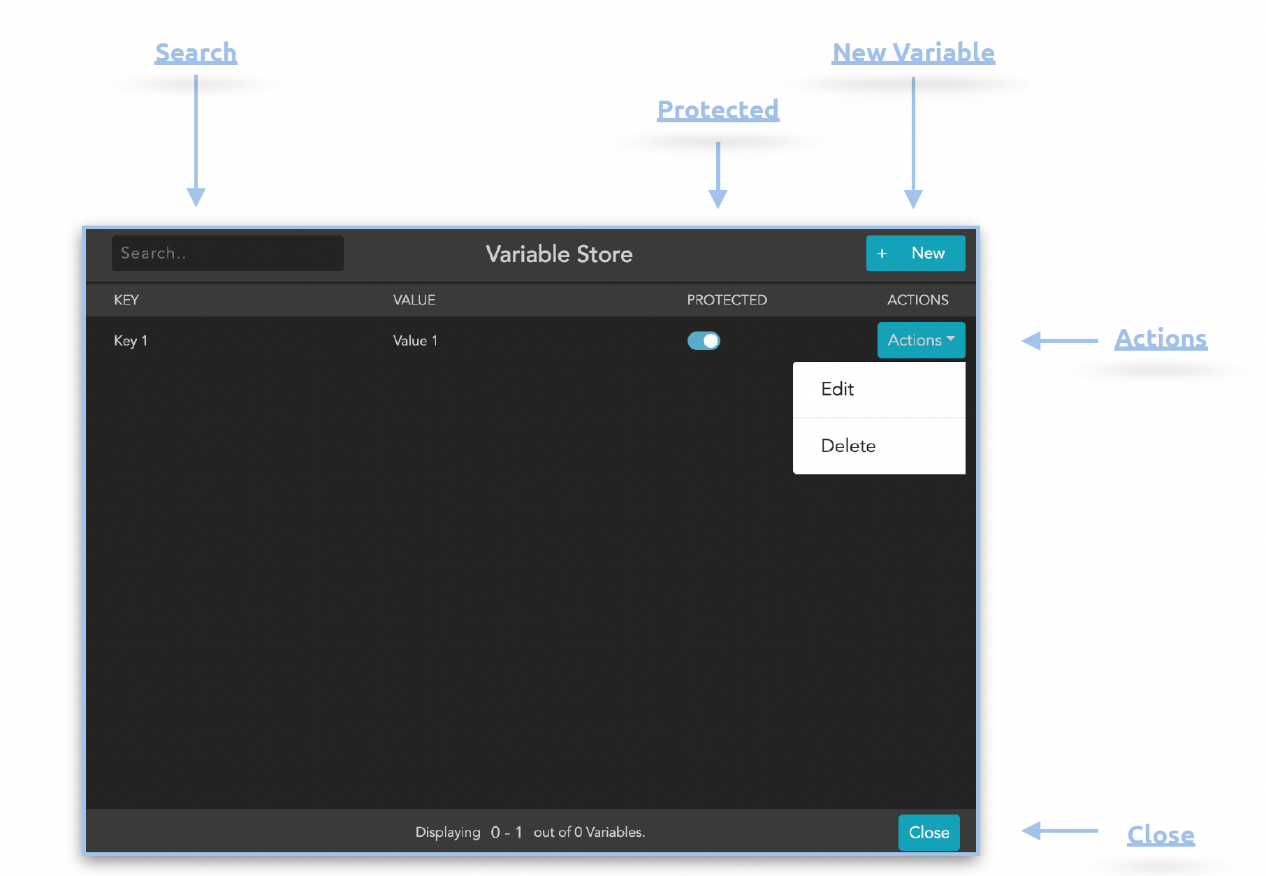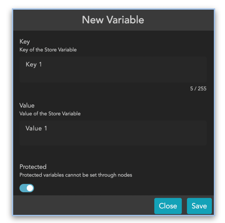 Opens a dialog for managing variables. In contrast to the variables that are managed via the Preferences menu, the variables managed here can also be controlled via streams, i.e. they can be created, changed or deleted via stream. They can also be used globally within each stream. There are three different action nodes available for this.